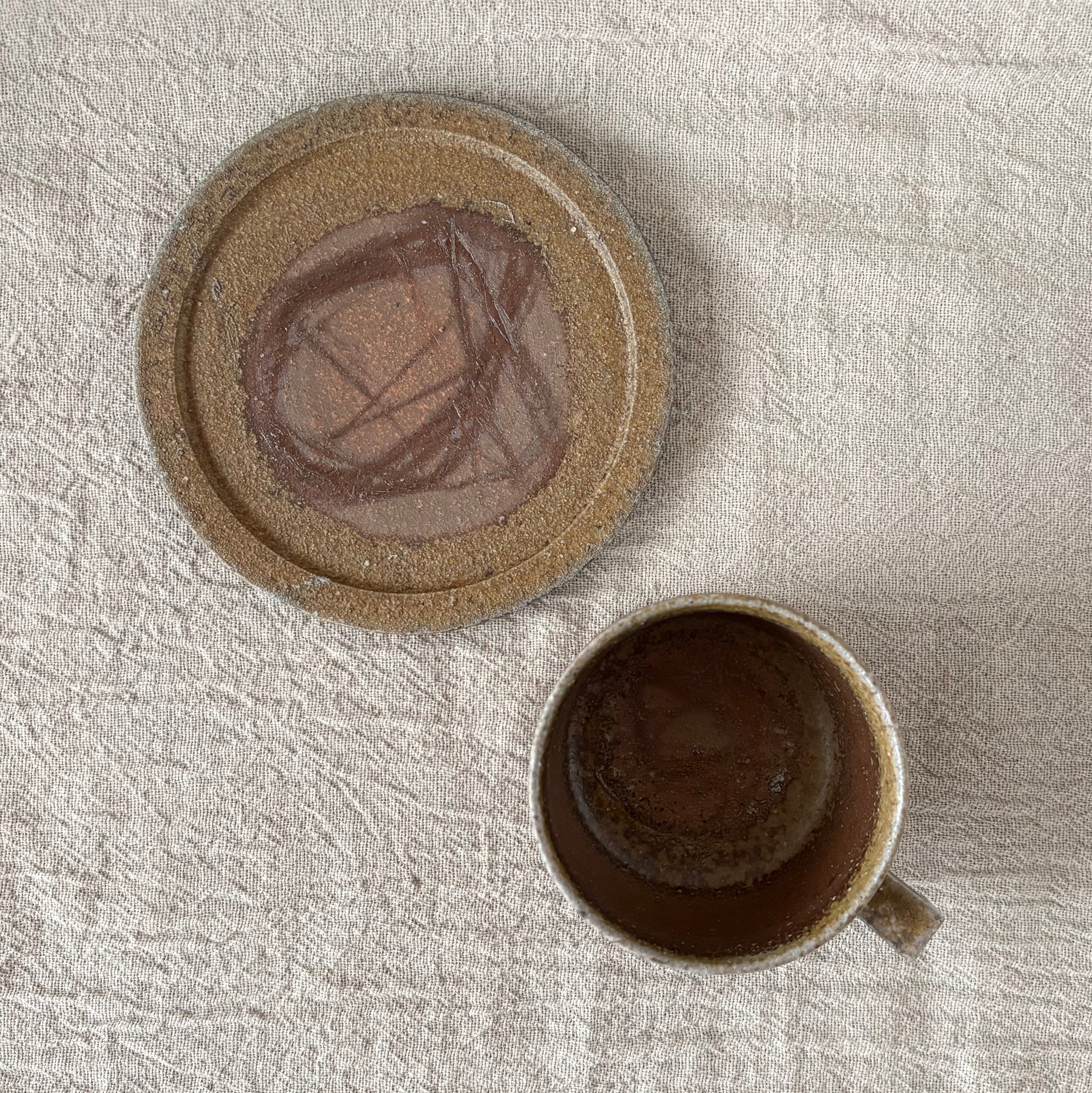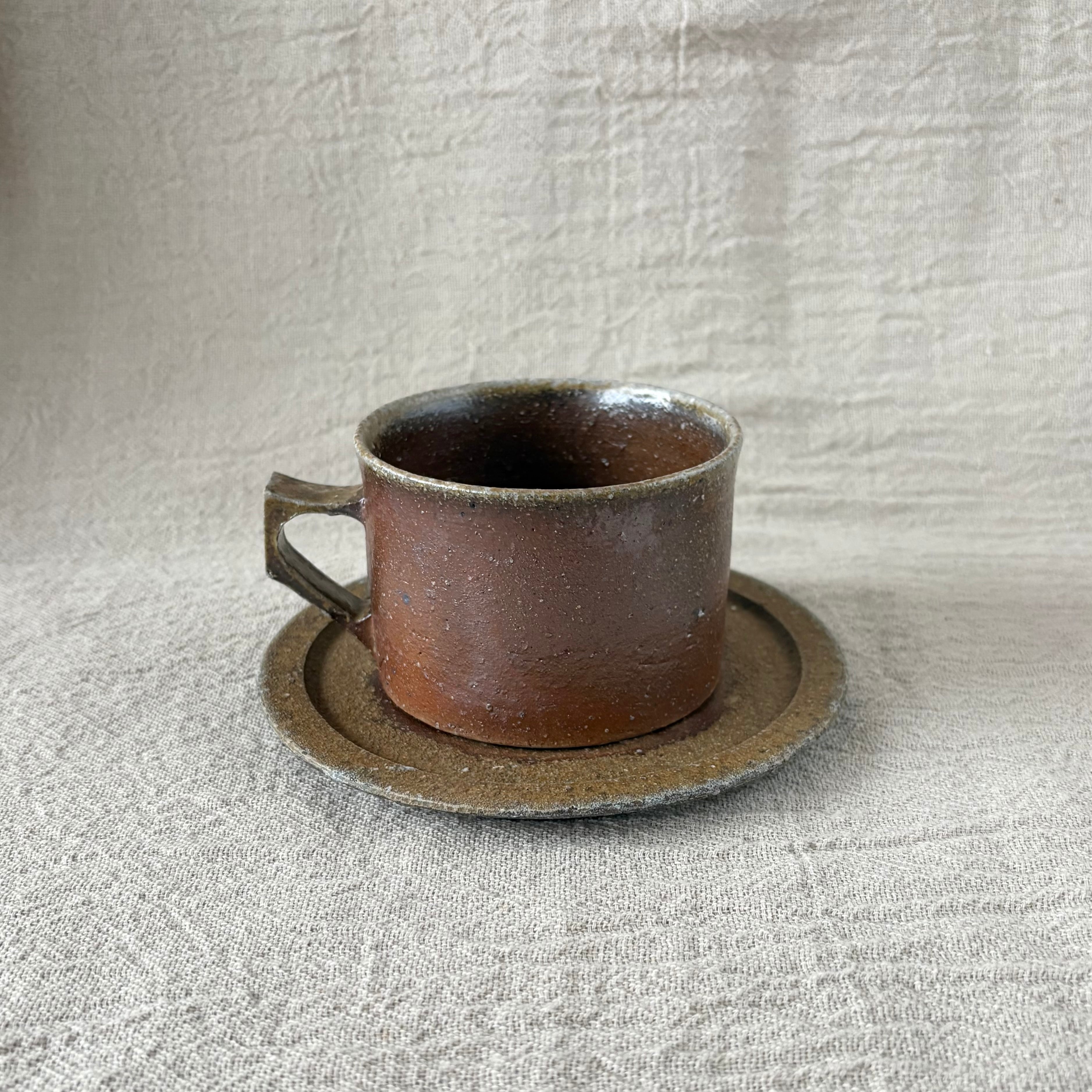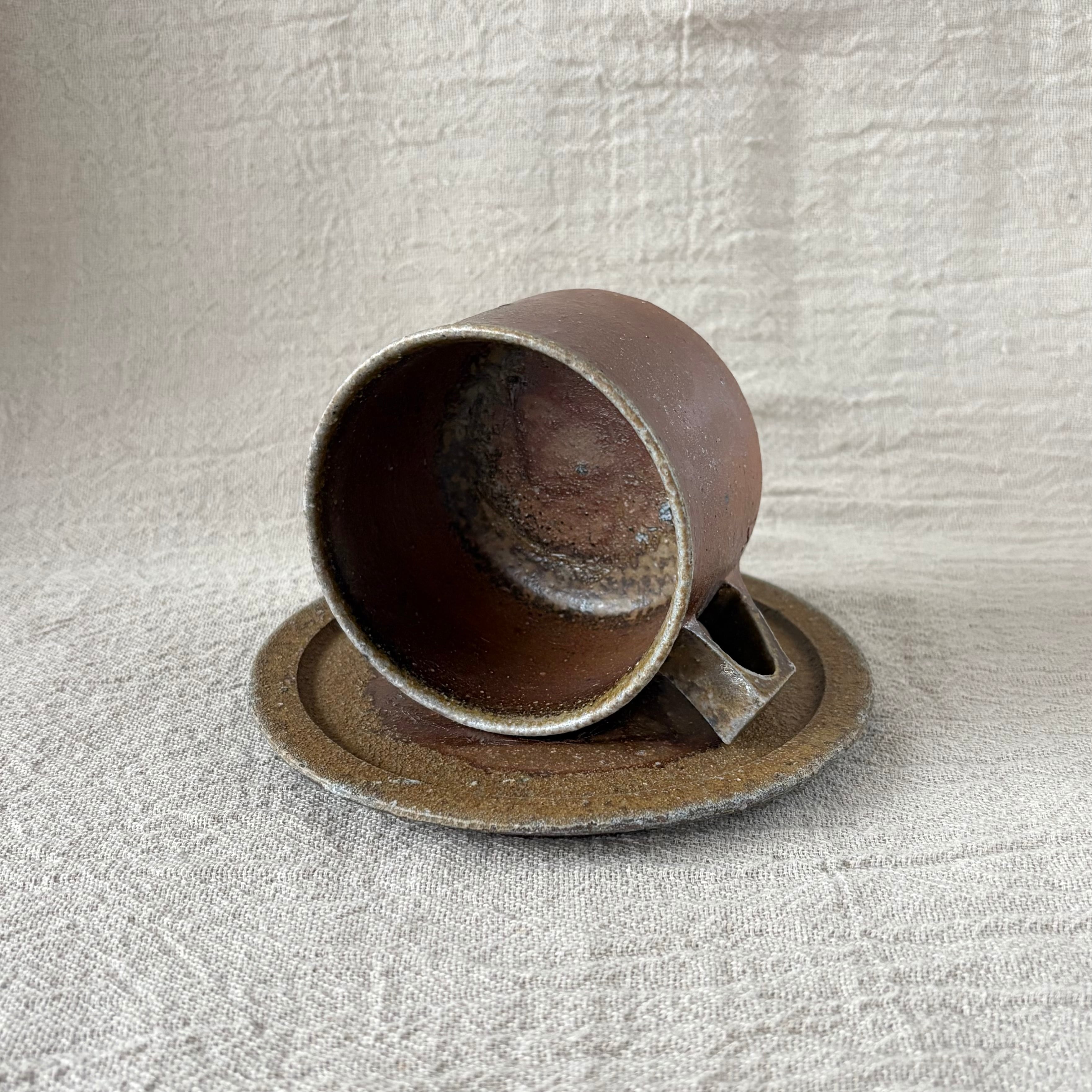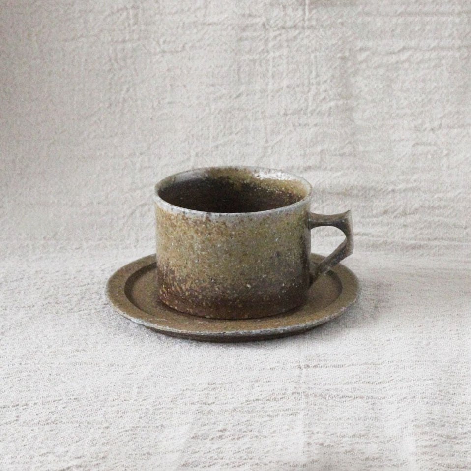 定番のカップ&ソーサーの中でも、「窯変(ようへん)」という、1度の窯でもあまりとれない貴重な焼け色のカップ&ソーサーです。登り窯で焼成した際に、たっぷりとかかって溶けた灰が特徴です。